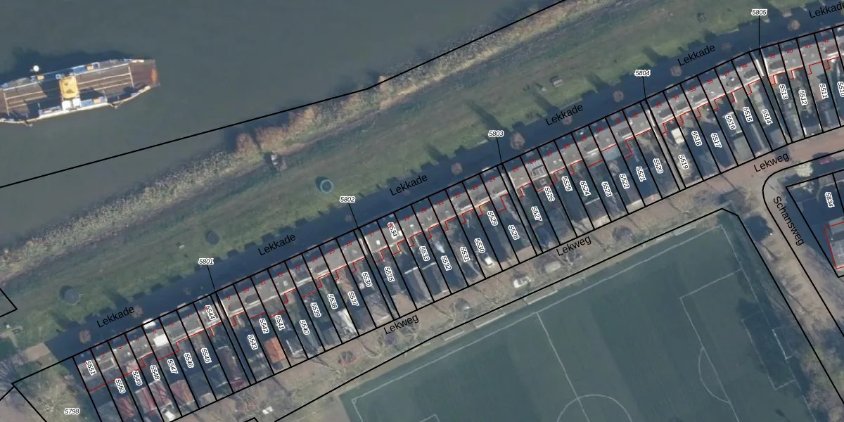 Het perceel waarop Lekkade 20 staat heeft een oppervlakte van 104 m². Dit is een middelgroot perceel. De perceeloppervlakte wordt geregistreerd door het Kadaster. Gedetailleerde informatie over de maten van dit perceel kunt u vinden in het rapport Kadastrale kaart met maatvoering van Lekkade 20.