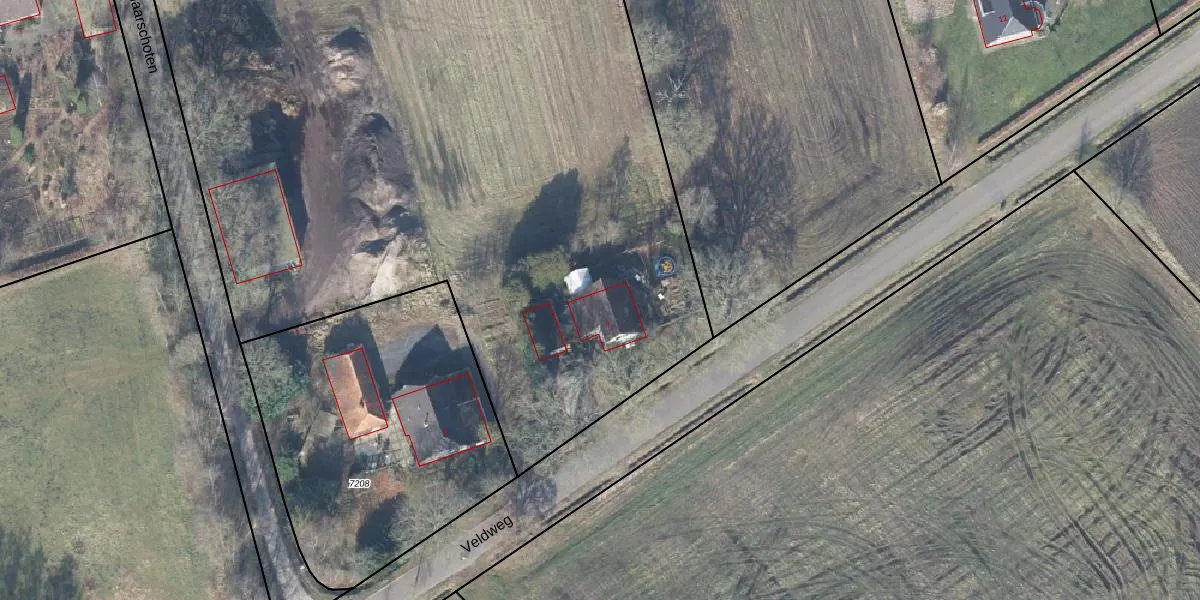 Het perceel waarop Veldweg 7 staat heeft een oppervlakte van 1,4 ha. Dit is een zeer groot perceel. De perceeloppervlakte wordt geregistreerd door het Kadaster. Gedetailleerde informatie over de maten van dit perceel kunt u vinden in het rapport Kadastrale kaart met maatvoering van Veldweg 7.