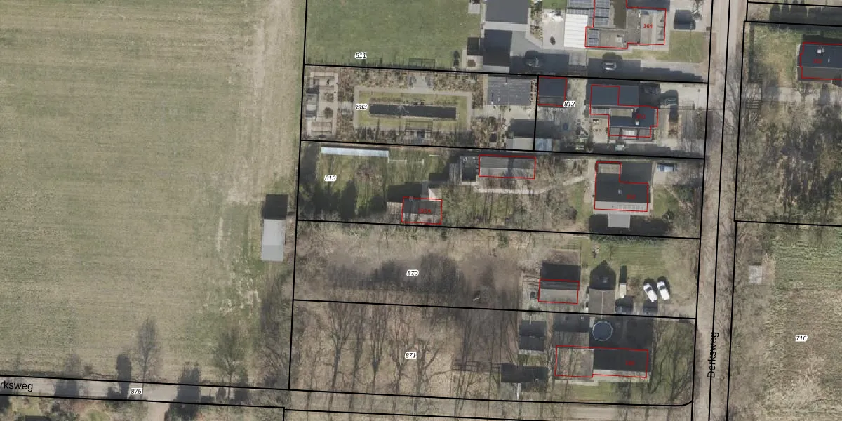 Het perceel waarop Derksweg 162-A staat heeft een oppervlakte van 1825 m². Dit is een zeer groot perceel. De perceeloppervlakte wordt geregistreerd door het Kadaster. Gedetailleerde informatie over de maten van dit perceel kunt u vinden in het rapport Kadastrale kaart met maatvoering van Derksweg 162-A.