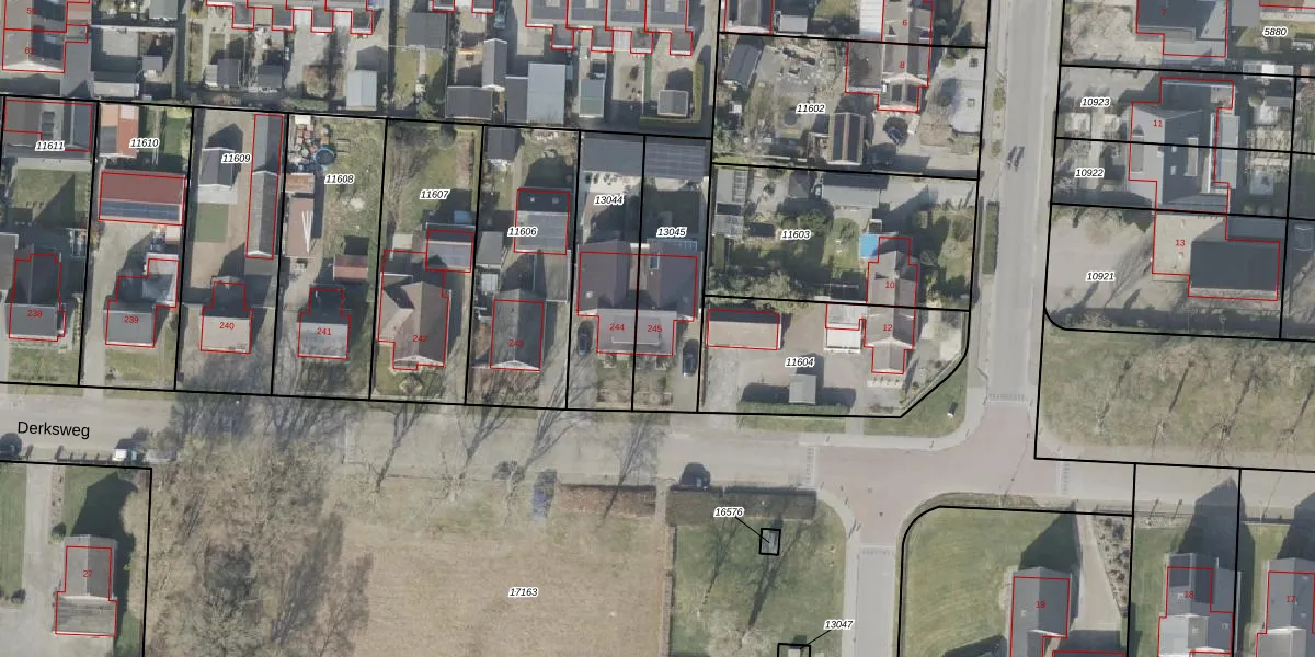 Derksweg 245 is gelegen op kadastraal perceel EMN00I13045. Deze kadastrale aanduiding is uniek en wordt gebruikt door het Kadaster om eigendomsrechten en andere zakelijke rechten vast te leggen. Het perceel maakt onderdeel uit van de kadastrale gemeente Emmen.