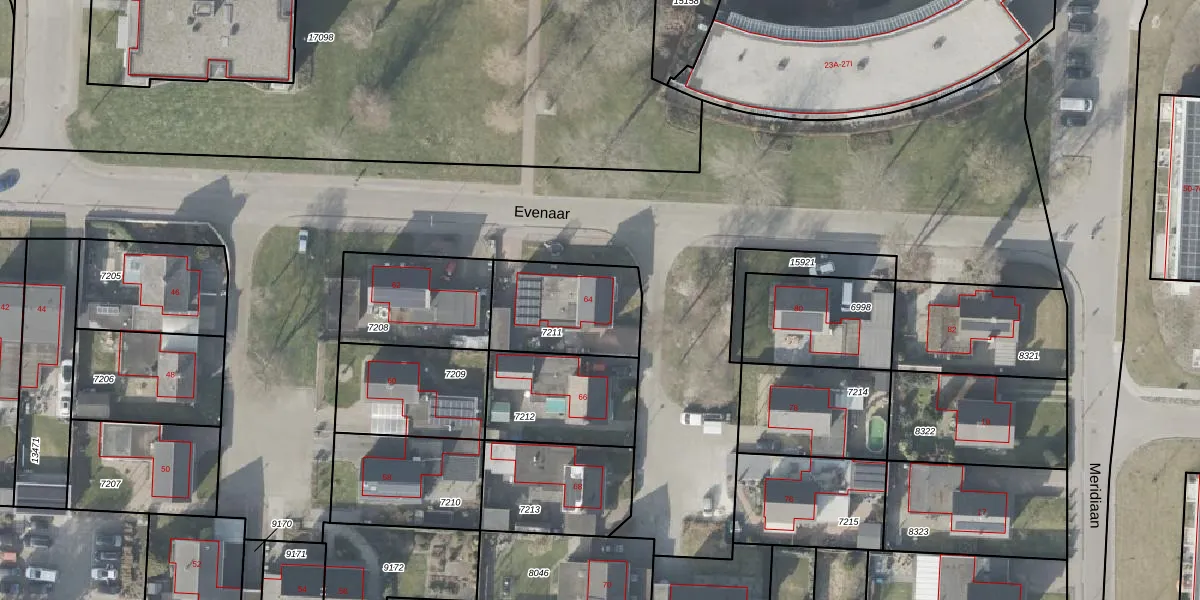 Het perceel waarop Evenaar 64 staat heeft een oppervlakte van 373 m². Dit is een groot perceel. De perceeloppervlakte wordt geregistreerd door het Kadaster. Gedetailleerde informatie over de maten van dit perceel kunt u vinden in het rapport Kadastrale kaart met maatvoering van Evenaar 64.