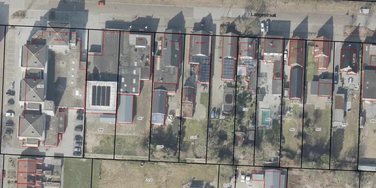 Het perceel waarop Langestraat 166-A staat heeft een oppervlakte van 990 m². Dit is een groot perceel. De perceeloppervlakte wordt geregistreerd door het Kadaster. Gedetailleerde informatie over de maten van dit perceel kunt u vinden in het rapport Kadastrale kaart met maatvoering van Langestraat 166-A.