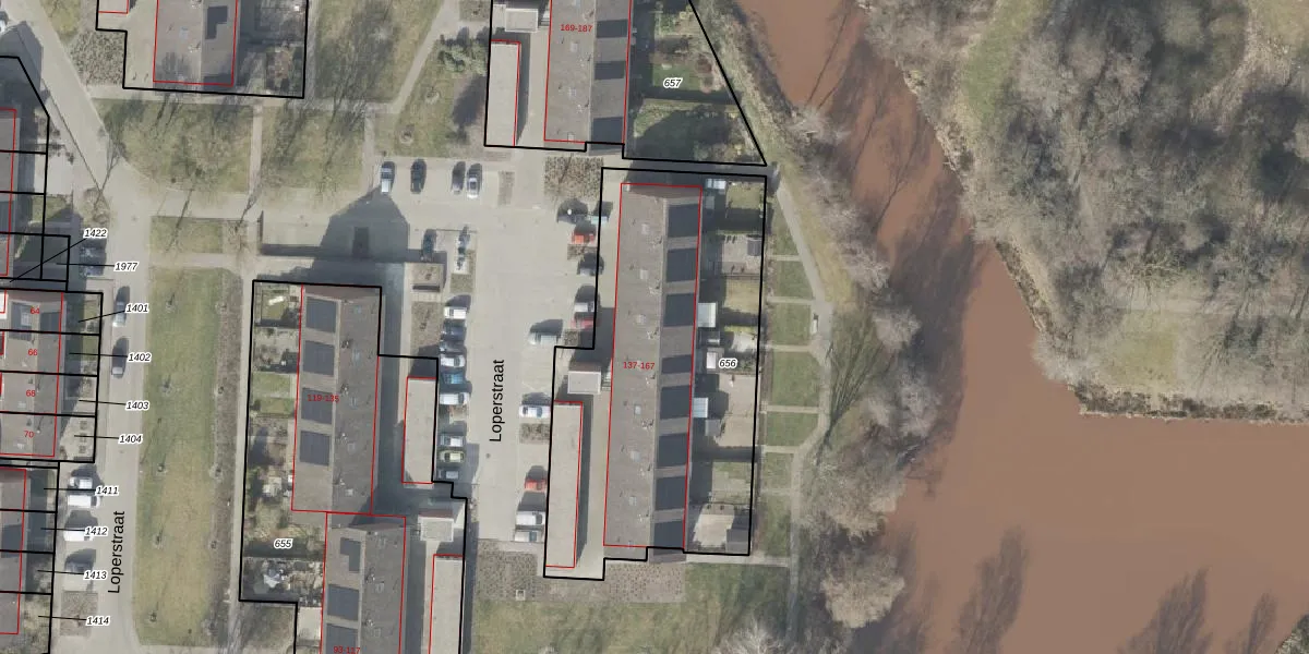 Het perceel waarop Loperstraat 155 staat heeft een oppervlakte van 1692 m². Dit is een zeer groot perceel. De perceeloppervlakte wordt geregistreerd door het Kadaster. Gedetailleerde informatie over de maten van dit perceel kunt u vinden in het rapport Kadastrale kaart met maatvoering van Loperstraat 155.