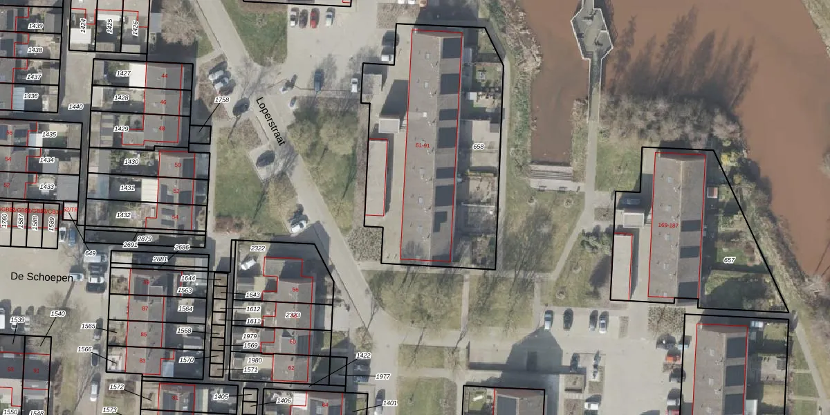 Het perceel waarop Loperstraat 61 staat heeft een oppervlakte van 1755 m². Dit is een zeer groot perceel. De perceeloppervlakte wordt geregistreerd door het Kadaster. Gedetailleerde informatie over de maten van dit perceel kunt u vinden in het rapport Kadastrale kaart met maatvoering van Loperstraat 61.
