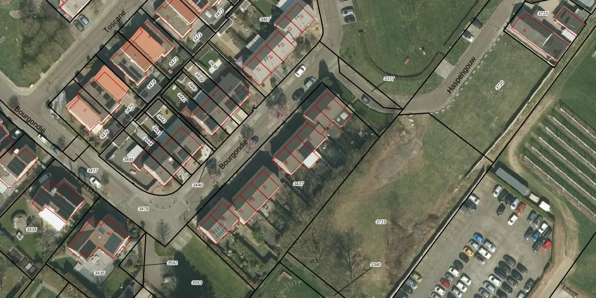 Het perceel waarop Bourgondië 22 staat heeft een oppervlakte van 1940 m². Dit is een zeer groot perceel. De perceeloppervlakte wordt geregistreerd door het Kadaster. Gedetailleerde informatie over de maten van dit perceel kunt u vinden in het rapport Kadastrale kaart met maatvoering van Bourgondië 22.