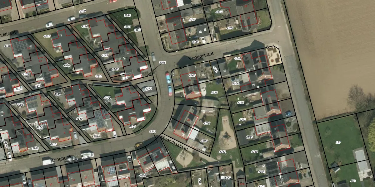 Het perceel waarop Dingbank 28 staat heeft een oppervlakte van 338 m². Dit is een groot perceel. De perceeloppervlakte wordt geregistreerd door het Kadaster. Gedetailleerde informatie over de maten van dit perceel kunt u vinden in het rapport Kadastrale kaart met maatvoering van Dingbank 28.