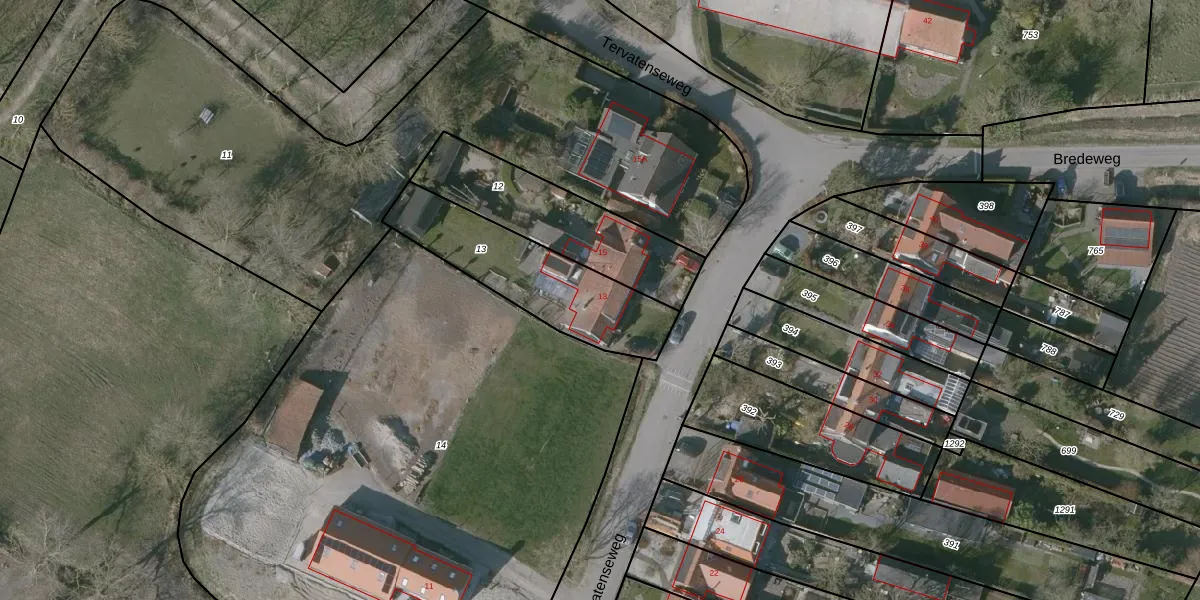 Het perceel waarop Tervatenseweg 13 staat heeft een oppervlakte van 515 m². Dit is een groot perceel. De perceeloppervlakte wordt geregistreerd door het Kadaster. Gedetailleerde informatie over de maten van dit perceel kunt u vinden in het rapport Kadastrale kaart met maatvoering van Tervatenseweg 13.