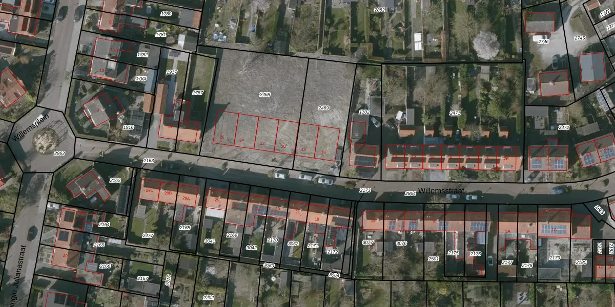 Het perceel waarop Willemsstraat 18 staat heeft een oppervlakte van 586 m². Dit is een groot perceel. De perceeloppervlakte wordt geregistreerd door het Kadaster. Gedetailleerde informatie over de maten van dit perceel kunt u vinden in het rapport Kadastrale kaart met maatvoering van Willemsstraat 18.