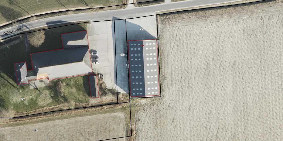 Het perceel waarop Dijksterweg 20-A staat heeft een oppervlakte van 1261 m². Dit is een zeer groot perceel. De perceeloppervlakte wordt geregistreerd door het Kadaster. Gedetailleerde informatie over de maten van dit perceel kunt u vinden in het rapport Kadastrale kaart met maatvoering van Dijksterweg 20-A.