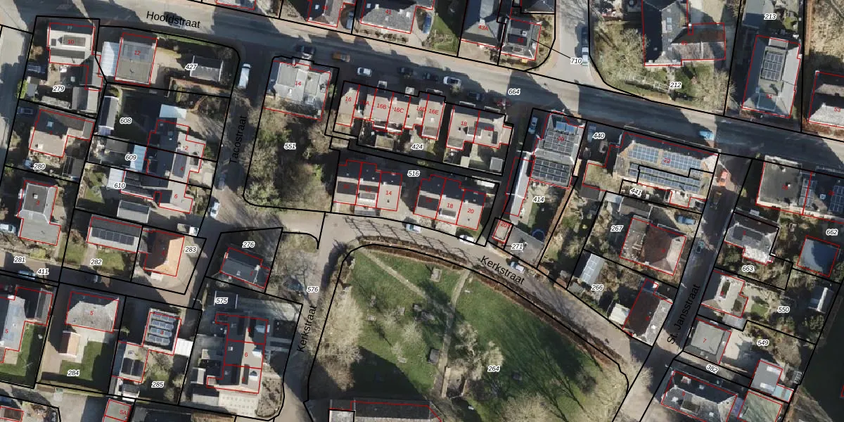 Het perceel waarop Kerkstraat 16 staat heeft een oppervlakte van 550 m². Dit is een groot perceel. De perceeloppervlakte wordt geregistreerd door het Kadaster. Gedetailleerde informatie over de maten van dit perceel kunt u vinden in het rapport Kadastrale kaart met maatvoering van Kerkstraat 16.
