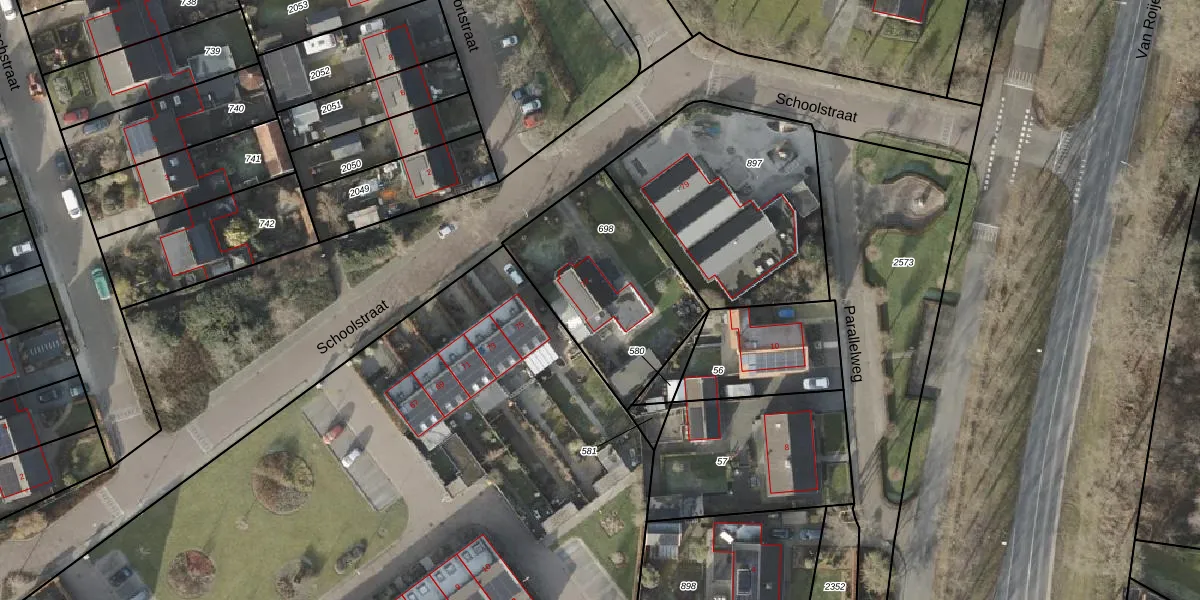 Het perceel waarop Schoolstraat 77 staat heeft een oppervlakte van 676 m². Dit is een groot perceel. De perceeloppervlakte wordt geregistreerd door het Kadaster. Gedetailleerde informatie over de maten van dit perceel kunt u vinden in het rapport Kadastrale kaart met maatvoering van Schoolstraat 77.