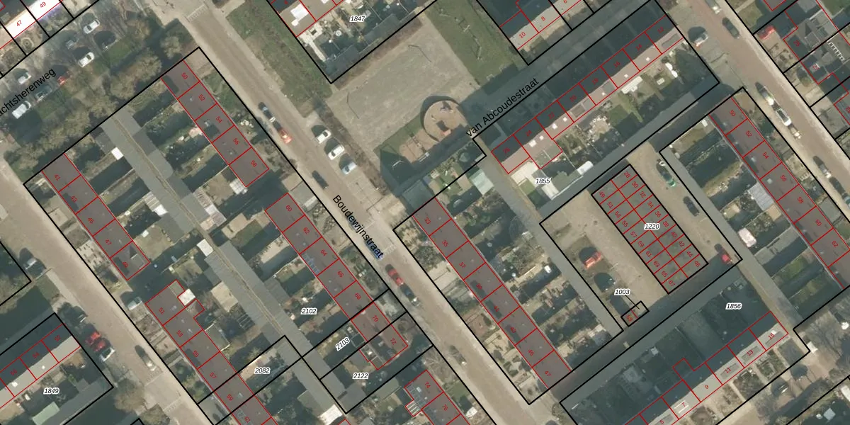 Het perceel waarop Boudewijnstraat 33 staat heeft een oppervlakte van 2845 m². Dit is een zeer groot perceel. De perceeloppervlakte wordt geregistreerd door het Kadaster. Gedetailleerde informatie over de maten van dit perceel kunt u vinden in het rapport Kadastrale kaart met maatvoering van Boudewijnstraat 33.