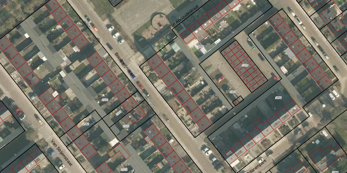 Het perceel waarop Boudewijnstraat 39 staat heeft een oppervlakte van 2845 m². Dit is een zeer groot perceel. De perceeloppervlakte wordt geregistreerd door het Kadaster. Gedetailleerde informatie over de maten van dit perceel kunt u vinden in het rapport Kadastrale kaart met maatvoering van Boudewijnstraat 39.