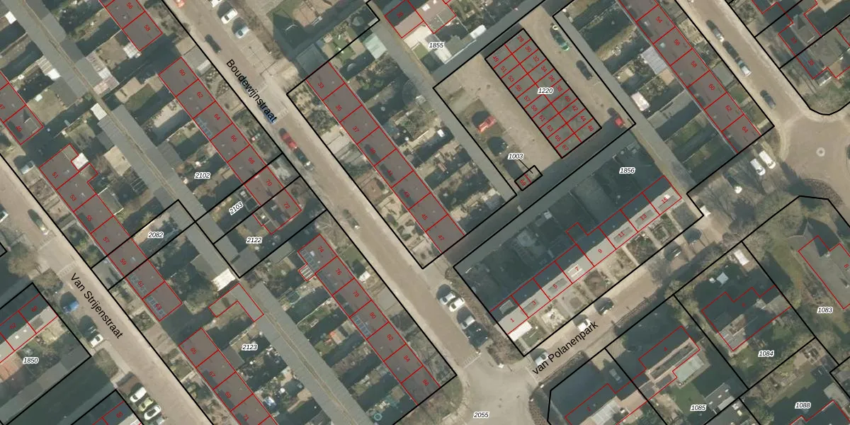 Het perceel waarop Boudewijnstraat 45 staat heeft een oppervlakte van 2845 m². Dit is een zeer groot perceel. De perceeloppervlakte wordt geregistreerd door het Kadaster. Gedetailleerde informatie over de maten van dit perceel kunt u vinden in het rapport Kadastrale kaart met maatvoering van Boudewijnstraat 45.