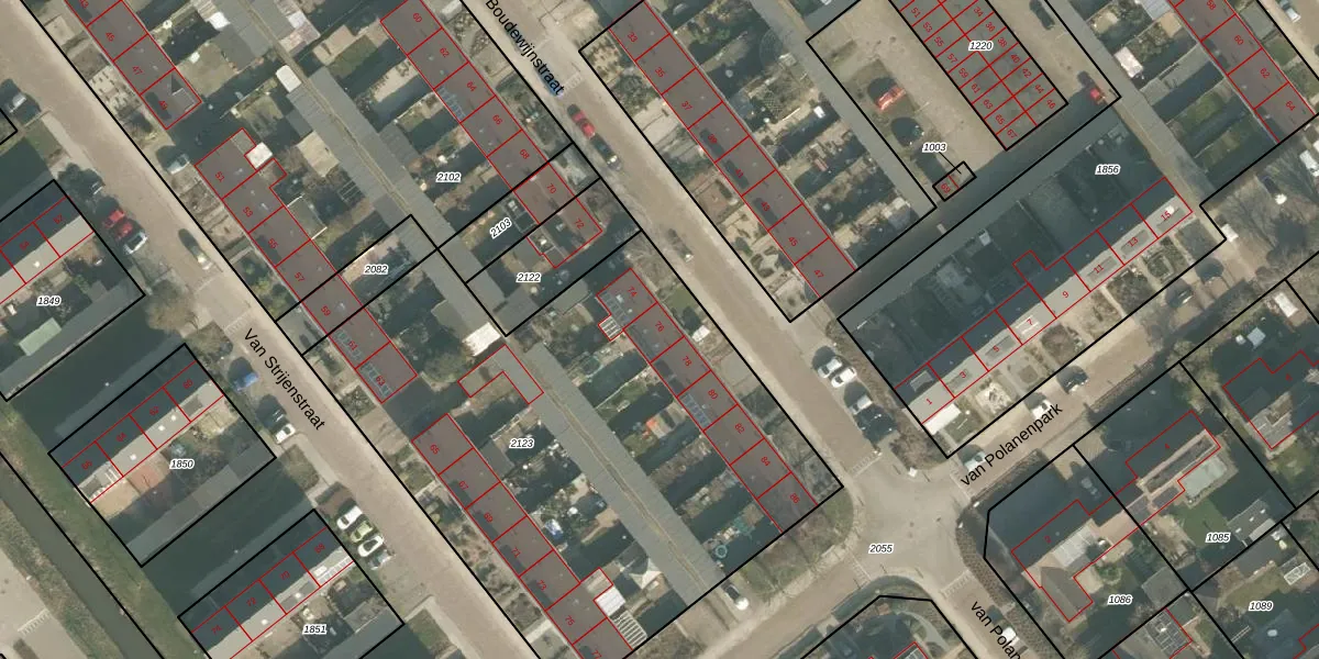 Het perceel waarop Boudewijnstraat 76 staat heeft een oppervlakte van 3025 m². Dit is een zeer groot perceel. De perceeloppervlakte wordt geregistreerd door het Kadaster. Gedetailleerde informatie over de maten van dit perceel kunt u vinden in het rapport Kadastrale kaart met maatvoering van Boudewijnstraat 76.
