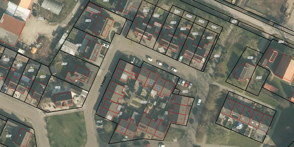 Het perceel waarop 't Hooft 15 staat heeft een oppervlakte van 2475 m². Dit is een zeer groot perceel. De perceeloppervlakte wordt geregistreerd door het Kadaster. Gedetailleerde informatie over de maten van dit perceel kunt u vinden in het rapport Kadastrale kaart met maatvoering van 't Hooft 15.