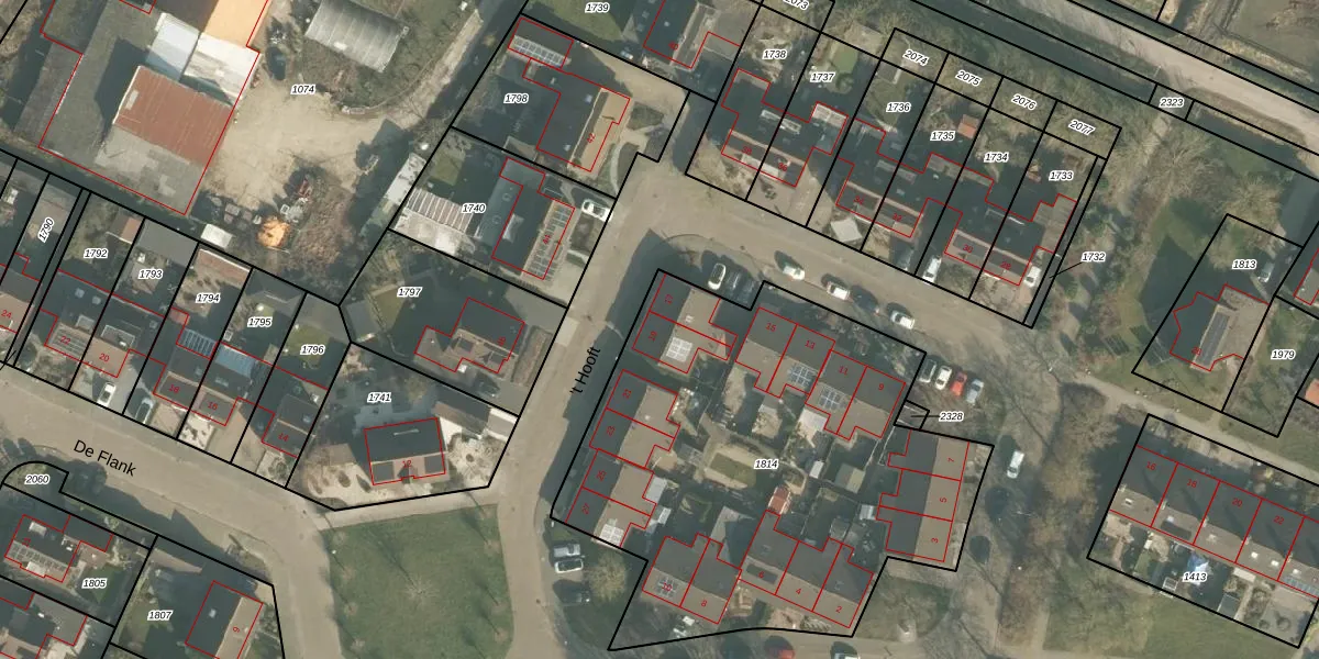 Het perceel waarop 't Hooft 19 staat heeft een oppervlakte van 2475 m². Dit is een zeer groot perceel. De perceeloppervlakte wordt geregistreerd door het Kadaster. Gedetailleerde informatie over de maten van dit perceel kunt u vinden in het rapport Kadastrale kaart met maatvoering van 't Hooft 19.