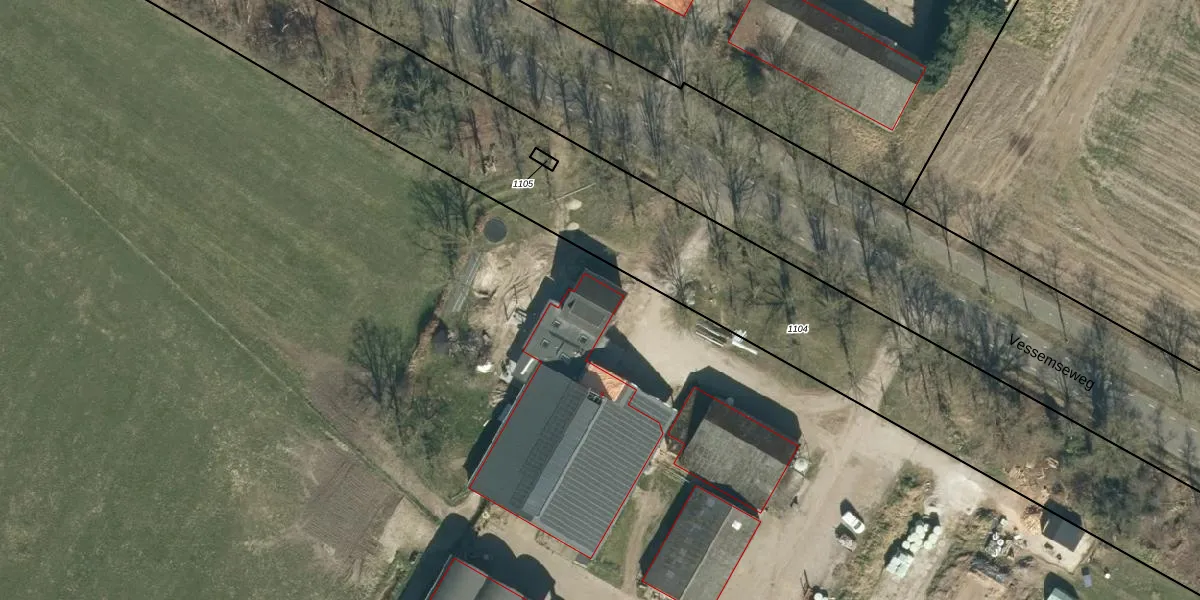 Het perceel waarop Vessemseweg 9 staat heeft een oppervlakte van 12,6 ha. Dit is een zeer groot perceel. De perceeloppervlakte wordt geregistreerd door het Kadaster. Gedetailleerde informatie over de maten van dit perceel kunt u vinden in het rapport Kadastrale kaart met maatvoering van Vessemseweg 9.