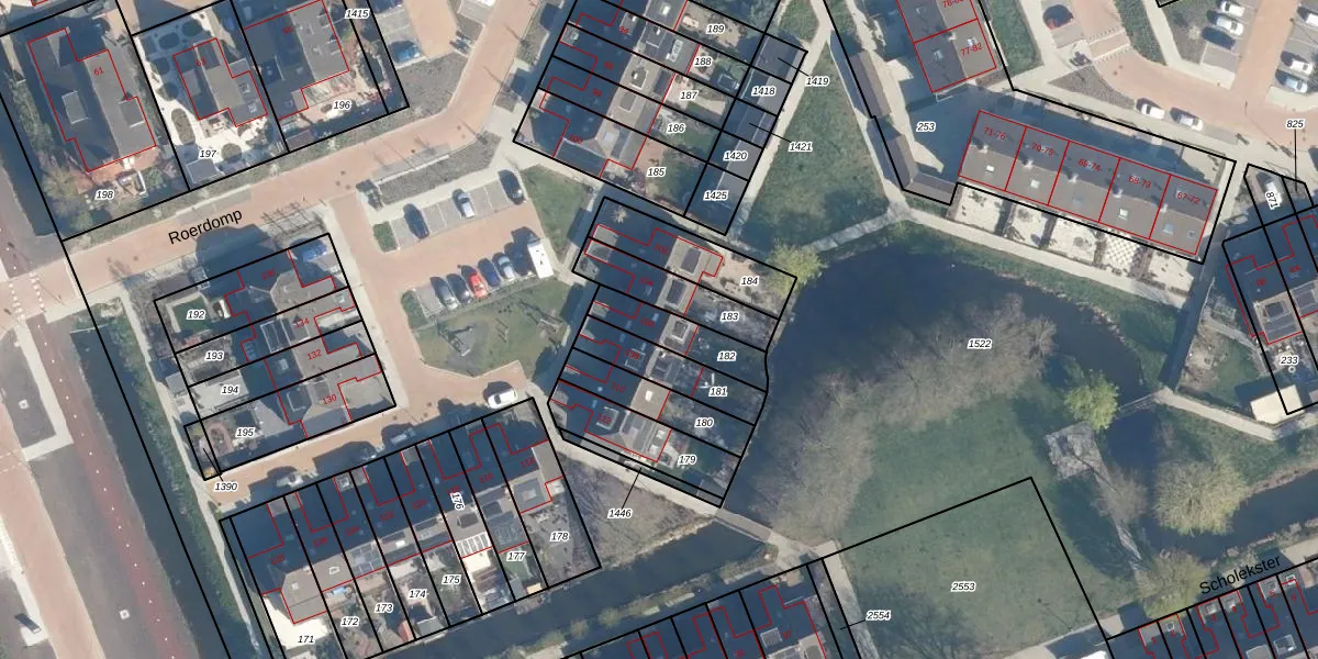 Het perceel waarop Roerdomp 106 staat heeft een oppervlakte van 156 m². Dit is een middelgroot perceel. De perceeloppervlakte wordt geregistreerd door het Kadaster. Gedetailleerde informatie over de maten van dit perceel kunt u vinden in het rapport Kadastrale kaart met maatvoering van Roerdomp 106.