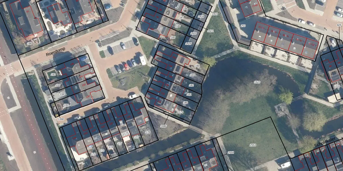 Het perceel waarop Roerdomp 108 staat heeft een oppervlakte van 162 m². Dit is een middelgroot perceel. De perceeloppervlakte wordt geregistreerd door het Kadaster. Gedetailleerde informatie over de maten van dit perceel kunt u vinden in het rapport Kadastrale kaart met maatvoering van Roerdomp 108.