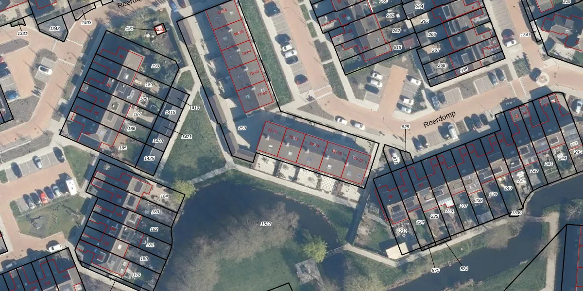 Het perceel waarop Roerdomp 75 staat heeft een oppervlakte van 1759 m². Dit is een zeer groot perceel. De perceeloppervlakte wordt geregistreerd door het Kadaster. Gedetailleerde informatie over de maten van dit perceel kunt u vinden in het rapport Kadastrale kaart met maatvoering van Roerdomp 75.