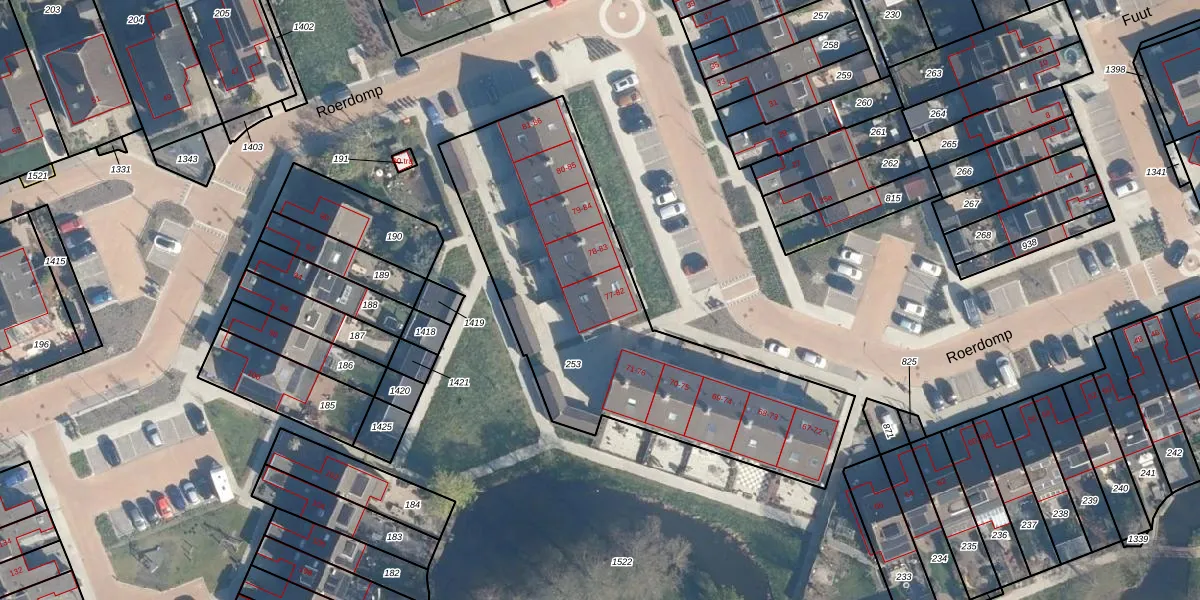 Het perceel waarop Roerdomp 82 staat heeft een oppervlakte van 1759 m². Dit is een zeer groot perceel. De perceeloppervlakte wordt geregistreerd door het Kadaster. Gedetailleerde informatie over de maten van dit perceel kunt u vinden in het rapport Kadastrale kaart met maatvoering van Roerdomp 82.