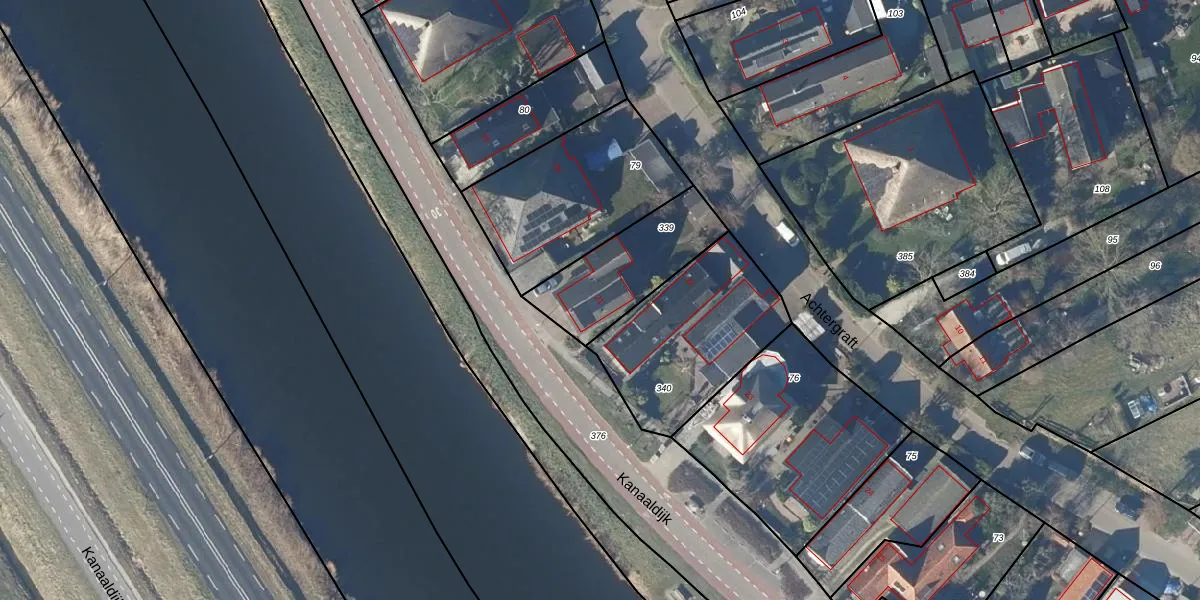Het perceel waarop Kanaaldijk 21 staat heeft een oppervlakte van 385 m². Dit is een groot perceel. De perceeloppervlakte wordt geregistreerd door het Kadaster. Gedetailleerde informatie over de maten van dit perceel kunt u vinden in het rapport Kadastrale kaart met maatvoering van Kanaaldijk 21.