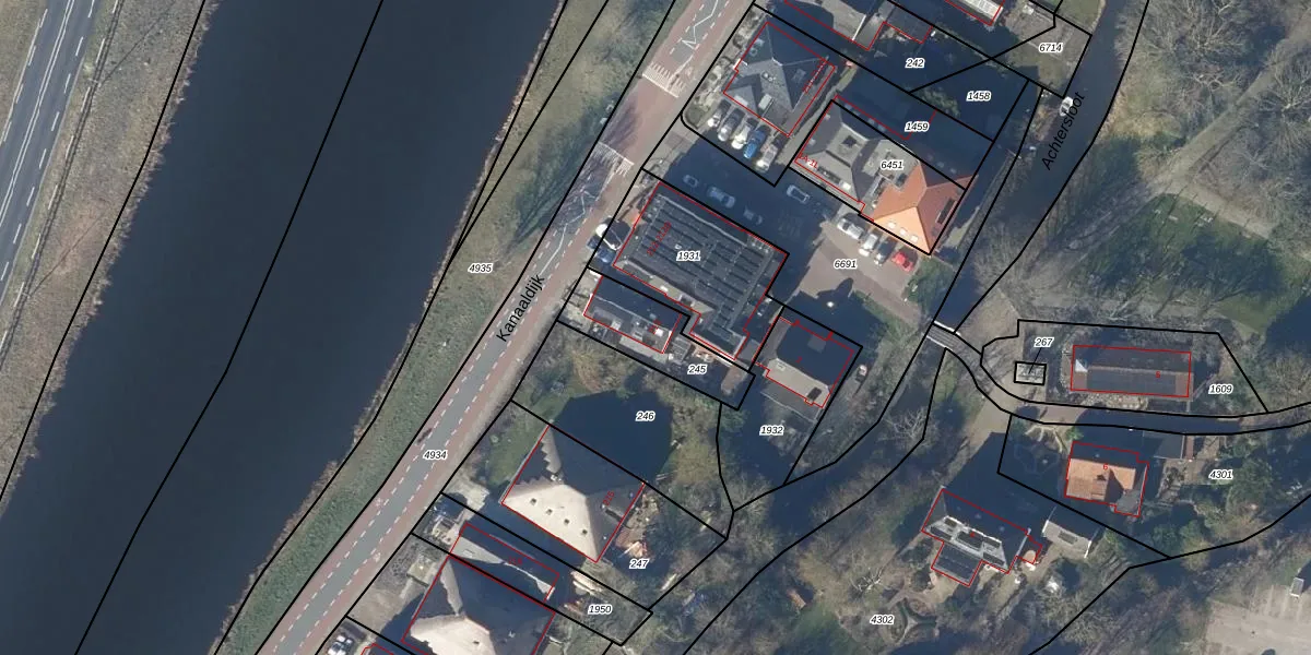 Het perceel waarop Kanaaldijk 213 staat heeft een oppervlakte van 245 m². Dit is een middelgroot perceel. De perceeloppervlakte wordt geregistreerd door het Kadaster. Gedetailleerde informatie over de maten van dit perceel kunt u vinden in het rapport Kadastrale kaart met maatvoering van Kanaaldijk 213.