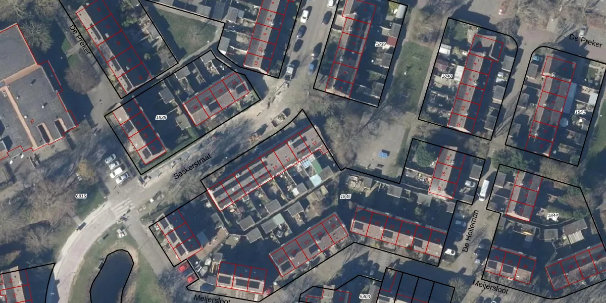Het perceel waarop Saskerstraat 15 staat heeft een oppervlakte van 3627 m². Dit is een zeer groot perceel. De perceeloppervlakte wordt geregistreerd door het Kadaster. Gedetailleerde informatie over de maten van dit perceel kunt u vinden in het rapport Kadastrale kaart met maatvoering van Saskerstraat 15.