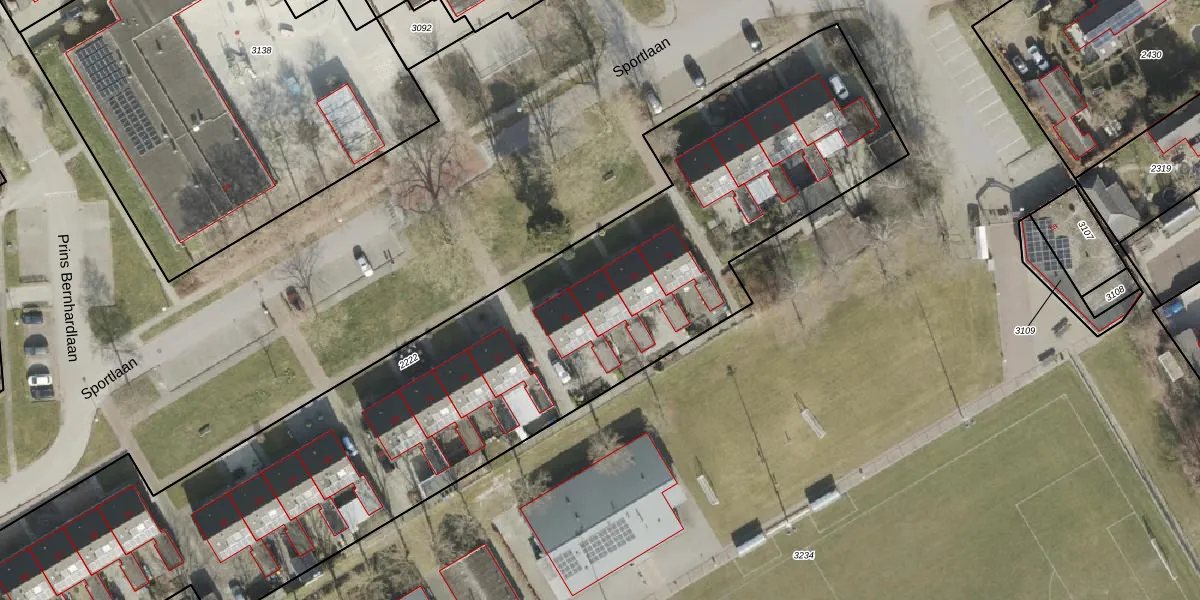 Het perceel waarop Sportlaan 13 staat heeft een oppervlakte van 4109 m². Dit is een zeer groot perceel. De perceeloppervlakte wordt geregistreerd door het Kadaster. Gedetailleerde informatie over de maten van dit perceel kunt u vinden in het rapport Kadastrale kaart met maatvoering van Sportlaan 13.