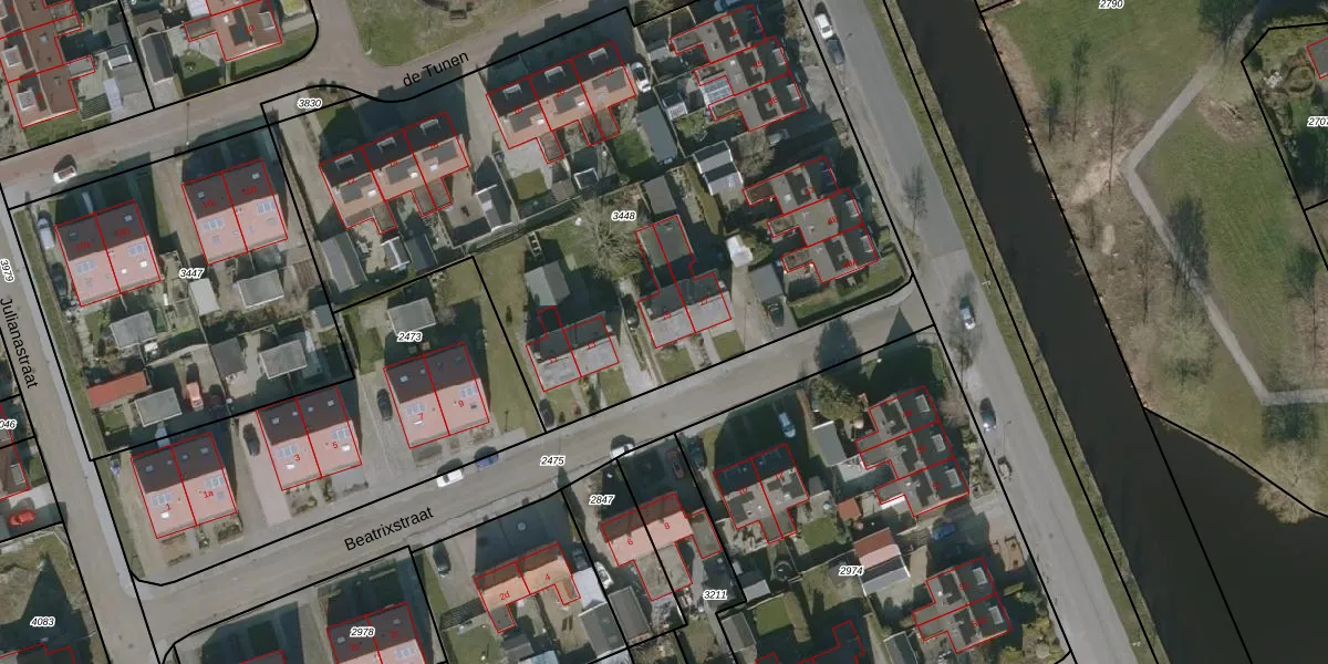 Het perceel waarop Beatrixstraat 15 staat heeft een oppervlakte van 3850 m². Dit is een zeer groot perceel. De perceeloppervlakte wordt geregistreerd door het Kadaster. Gedetailleerde informatie over de maten van dit perceel kunt u vinden in het rapport Kadastrale kaart met maatvoering van Beatrixstraat 15.