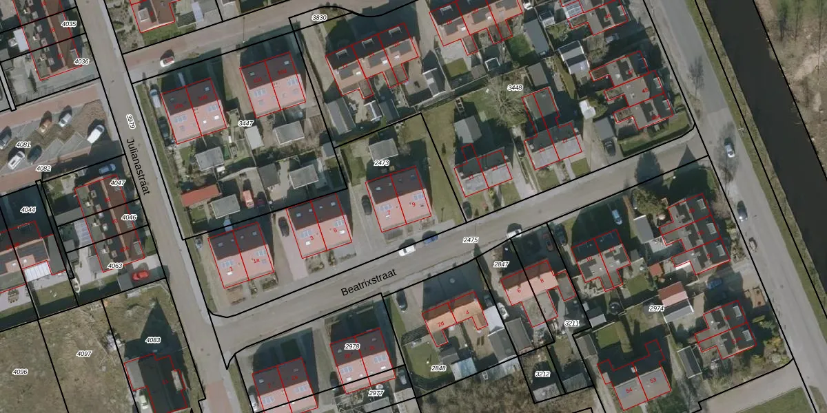 Het perceel waarop Beatrixstraat 9 staat heeft een oppervlakte van 1505 m². Dit is een zeer groot perceel. De perceeloppervlakte wordt geregistreerd door het Kadaster. Gedetailleerde informatie over de maten van dit perceel kunt u vinden in het rapport Kadastrale kaart met maatvoering van Beatrixstraat 9.