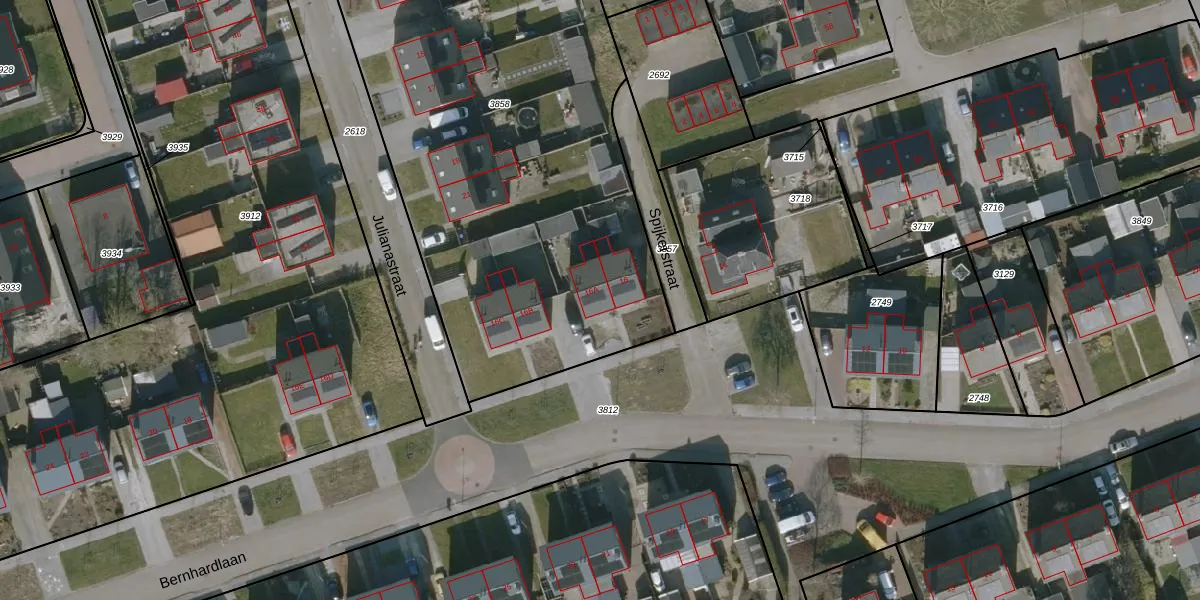 Het perceel waarop Bernhardlaan 16-A staat heeft een oppervlakte van 3523 m². Dit is een zeer groot perceel. De perceeloppervlakte wordt geregistreerd door het Kadaster. Gedetailleerde informatie over de maten van dit perceel kunt u vinden in het rapport Kadastrale kaart met maatvoering van Bernhardlaan 16-A.