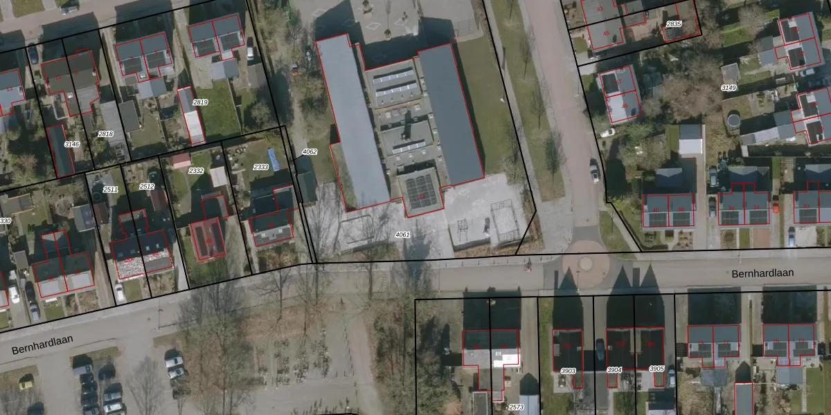 Het perceel waarop Bernhardlaan 42 staat heeft een oppervlakte van 3961 m². Dit is een zeer groot perceel. De perceeloppervlakte wordt geregistreerd door het Kadaster. Gedetailleerde informatie over de maten van dit perceel kunt u vinden in het rapport Kadastrale kaart met maatvoering van Bernhardlaan 42.