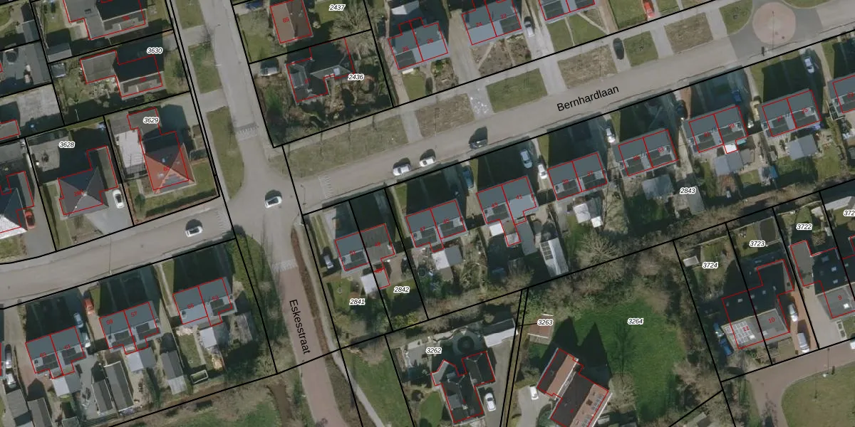 Het perceel waarop Bernhardlaan 47 staat heeft een oppervlakte van 4587 m². Dit is een zeer groot perceel. De perceeloppervlakte wordt geregistreerd door het Kadaster. Gedetailleerde informatie over de maten van dit perceel kunt u vinden in het rapport Kadastrale kaart met maatvoering van Bernhardlaan 47.