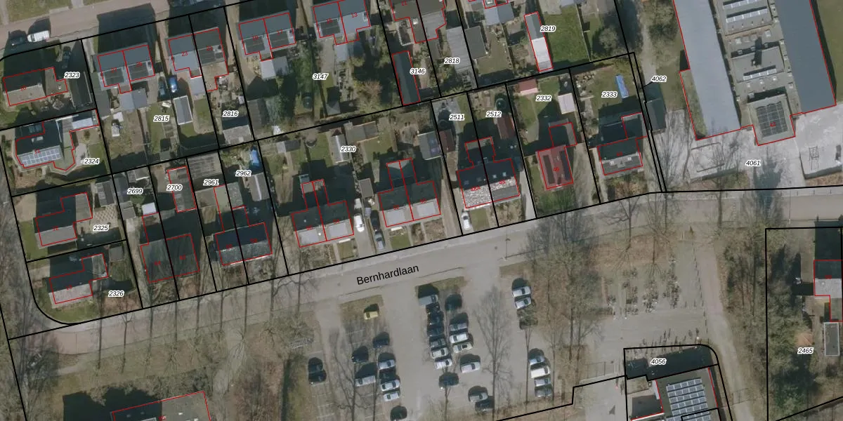 Het perceel waarop Bernhardlaan 50 staat heeft een oppervlakte van 1395 m². Dit is een zeer groot perceel. De perceeloppervlakte wordt geregistreerd door het Kadaster. Gedetailleerde informatie over de maten van dit perceel kunt u vinden in het rapport Kadastrale kaart met maatvoering van Bernhardlaan 50.