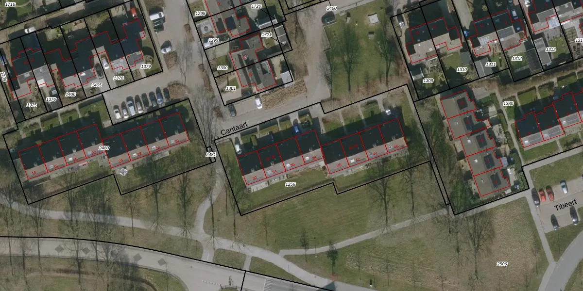 Het perceel waarop Cantaart 36 staat heeft een oppervlakte van 1945 m². Dit is een zeer groot perceel. De perceeloppervlakte wordt geregistreerd door het Kadaster. Gedetailleerde informatie over de maten van dit perceel kunt u vinden in het rapport Kadastrale kaart met maatvoering van Cantaart 36.
