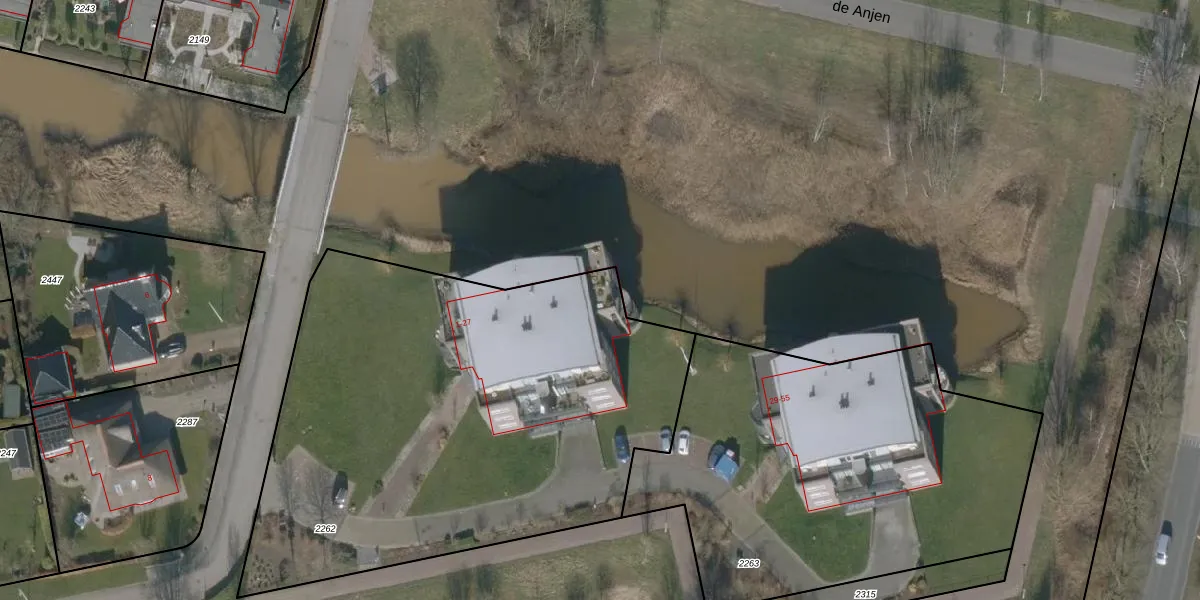 Het perceel waarop de Anjen 27 staat heeft een oppervlakte van 2905 m². Dit is een zeer groot perceel. De perceeloppervlakte wordt geregistreerd door het Kadaster. Gedetailleerde informatie over de maten van dit perceel kunt u vinden in het rapport Kadastrale kaart met maatvoering van de Anjen 27.