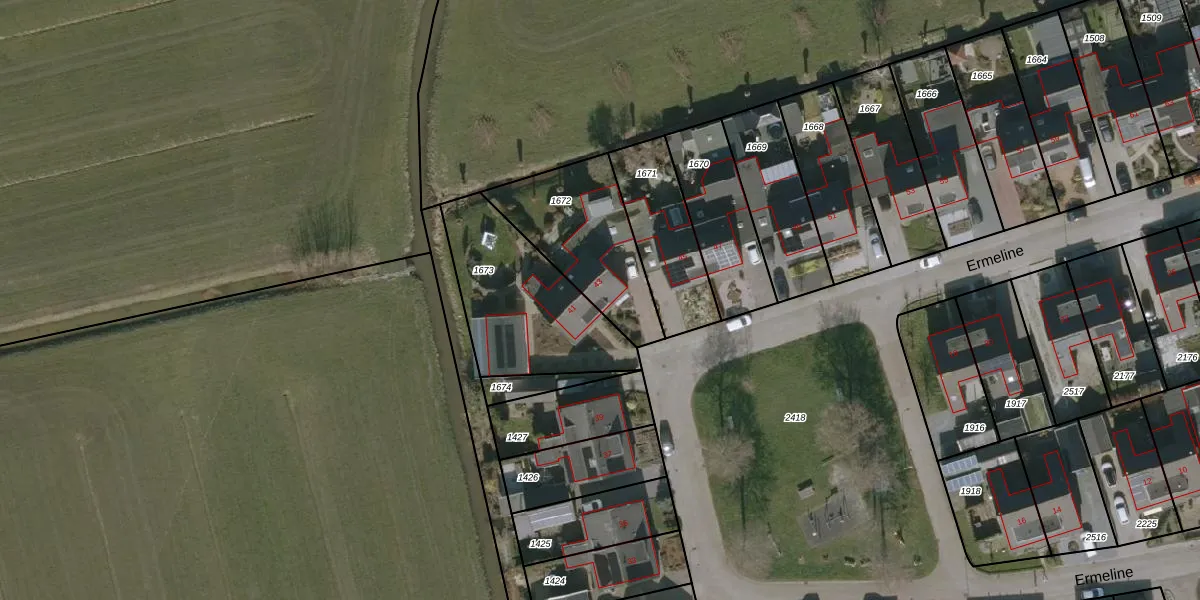 Het perceel waarop Ermeline 43 staat heeft een oppervlakte van 443 m². Dit is een groot perceel. De perceeloppervlakte wordt geregistreerd door het Kadaster. Gedetailleerde informatie over de maten van dit perceel kunt u vinden in het rapport Kadastrale kaart met maatvoering van Ermeline 43.