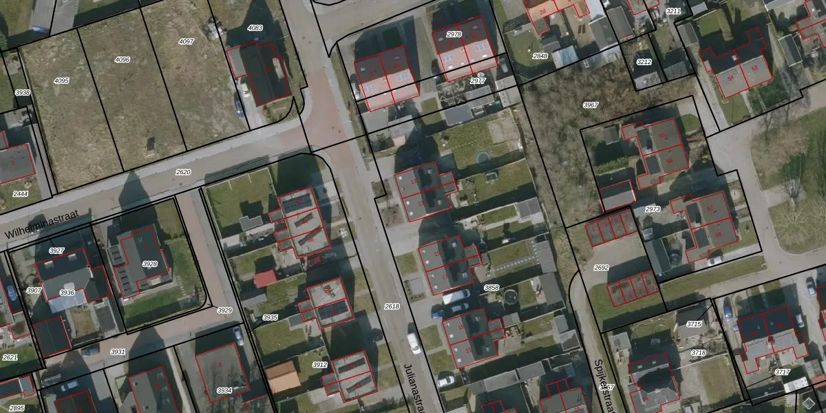 Het perceel waarop Julianastraat 13 staat heeft een oppervlakte van 3523 m². Dit is een zeer groot perceel. De perceeloppervlakte wordt geregistreerd door het Kadaster. Gedetailleerde informatie over de maten van dit perceel kunt u vinden in het rapport Kadastrale kaart met maatvoering van Julianastraat 13.