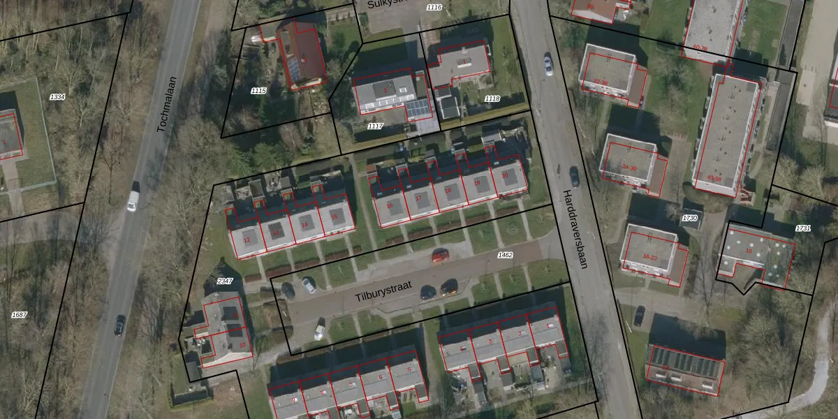 Het perceel waarop Tilburystraat 17 staat heeft een oppervlakte van 4840 m². Dit is een zeer groot perceel. De perceeloppervlakte wordt geregistreerd door het Kadaster. Gedetailleerde informatie over de maten van dit perceel kunt u vinden in het rapport Kadastrale kaart met maatvoering van Tilburystraat 17.