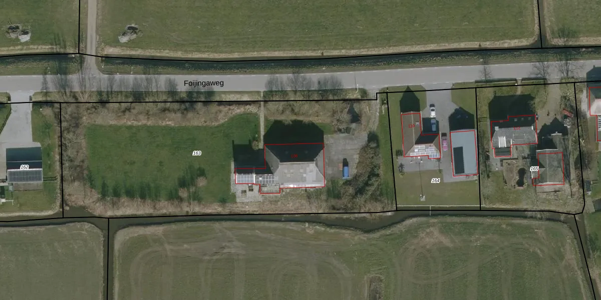 Foijingaweg 108 is gelegen op kadastraal perceel KLM00F163. Deze kadastrale aanduiding is uniek en wordt gebruikt door het Kadaster om eigendomsrechten en andere zakelijke rechten vast te leggen. Het perceel maakt onderdeel uit van de kadastrale gemeente Kollum.