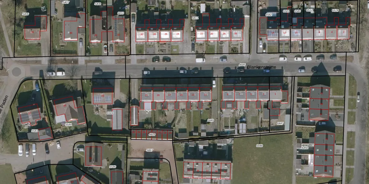 Het perceel waarop Blankenstrjitte 15 staat heeft een oppervlakte van 2386 m². Dit is een zeer groot perceel. De perceeloppervlakte wordt geregistreerd door het Kadaster. Gedetailleerde informatie over de maten van dit perceel kunt u vinden in het rapport Kadastrale kaart met maatvoering van Blankenstrjitte 15.