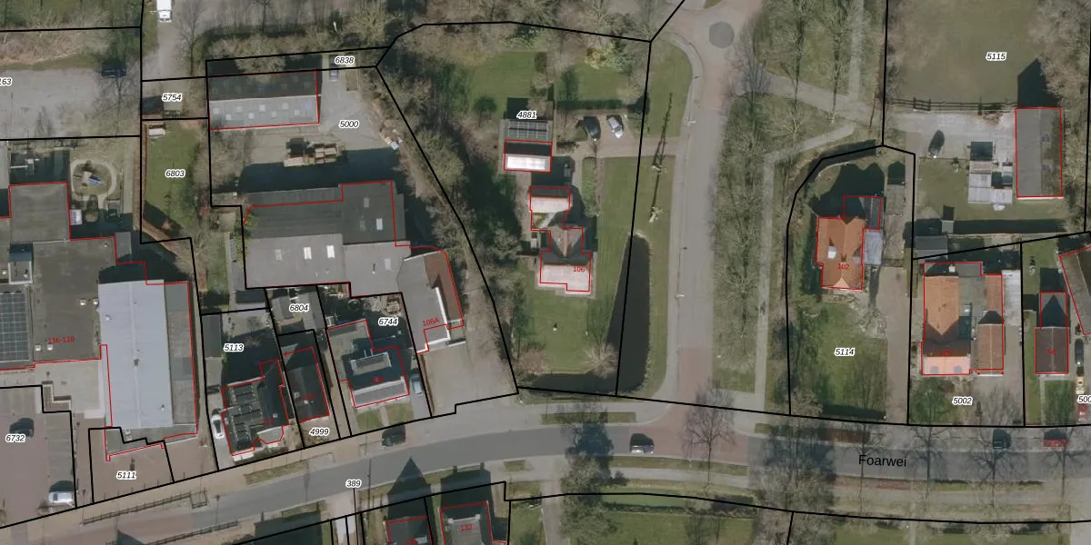 Foarwei 106 is gelegen op kadastraal perceel WTG01E4881. Deze kadastrale aanduiding is uniek en wordt gebruikt door het Kadaster om eigendomsrechten en andere zakelijke rechten vast te leggen. Het perceel maakt onderdeel uit van de kadastrale gemeente Westergeest.