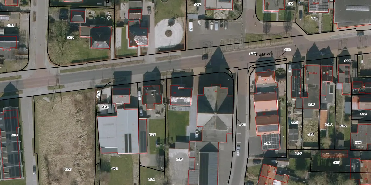 Het perceel waarop Foarwei 99 staat heeft een oppervlakte van 3161 m². Dit is een zeer groot perceel. De perceeloppervlakte wordt geregistreerd door het Kadaster. Gedetailleerde informatie over de maten van dit perceel kunt u vinden in het rapport Kadastrale kaart met maatvoering van Foarwei 99.