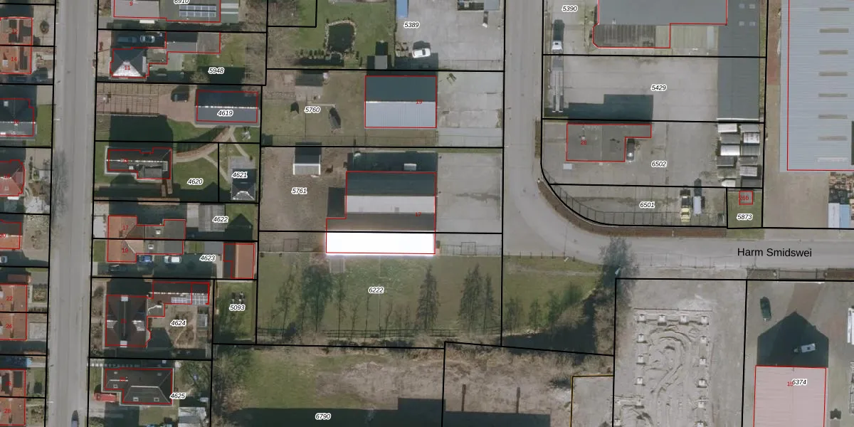 Harm Smidswei 17 is gelegen op kadastraal perceel WTG01E5761. Deze kadastrale aanduiding is uniek en wordt gebruikt door het Kadaster om eigendomsrechten en andere zakelijke rechten vast te leggen. Het perceel maakt onderdeel uit van de kadastrale gemeente Westergeest.