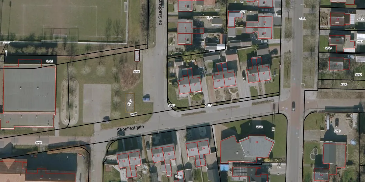 Het perceel waarop Skoallestrjitte 25 staat heeft een oppervlakte van 3877 m². Dit is een zeer groot perceel. De perceeloppervlakte wordt geregistreerd door het Kadaster. Gedetailleerde informatie over de maten van dit perceel kunt u vinden in het rapport Kadastrale kaart met maatvoering van Skoallestrjitte 25.