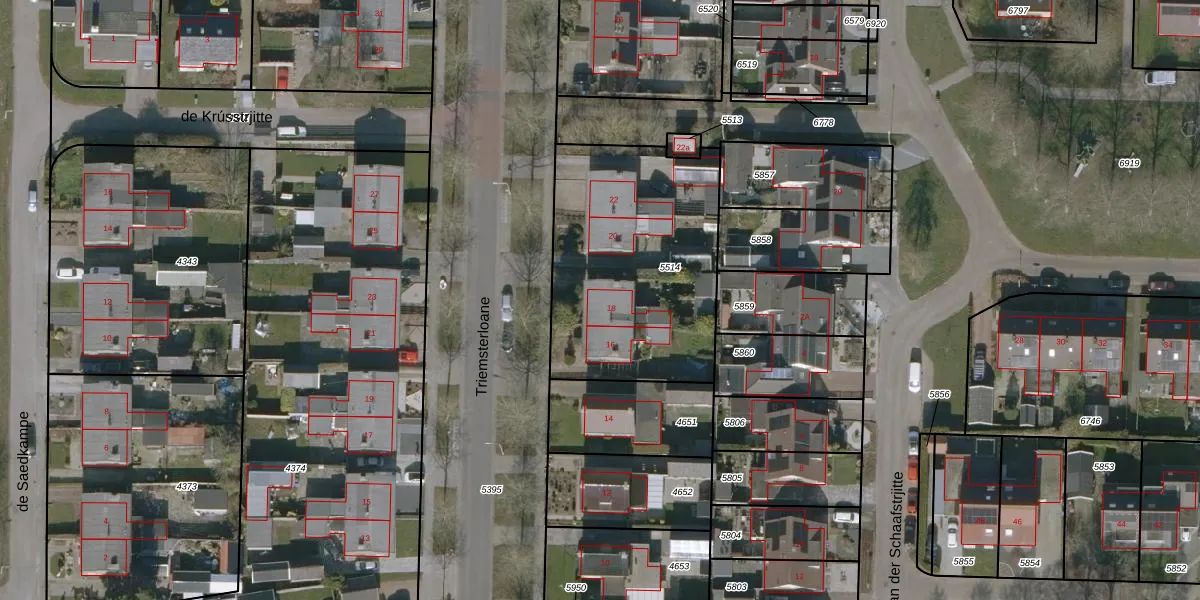 Triemsterloane 18 is gelegen op kadastraal perceel WTG01E5514. Deze kadastrale aanduiding is uniek en wordt gebruikt door het Kadaster om eigendomsrechten en andere zakelijke rechten vast te leggen. Het perceel maakt onderdeel uit van de kadastrale gemeente Westergeest.