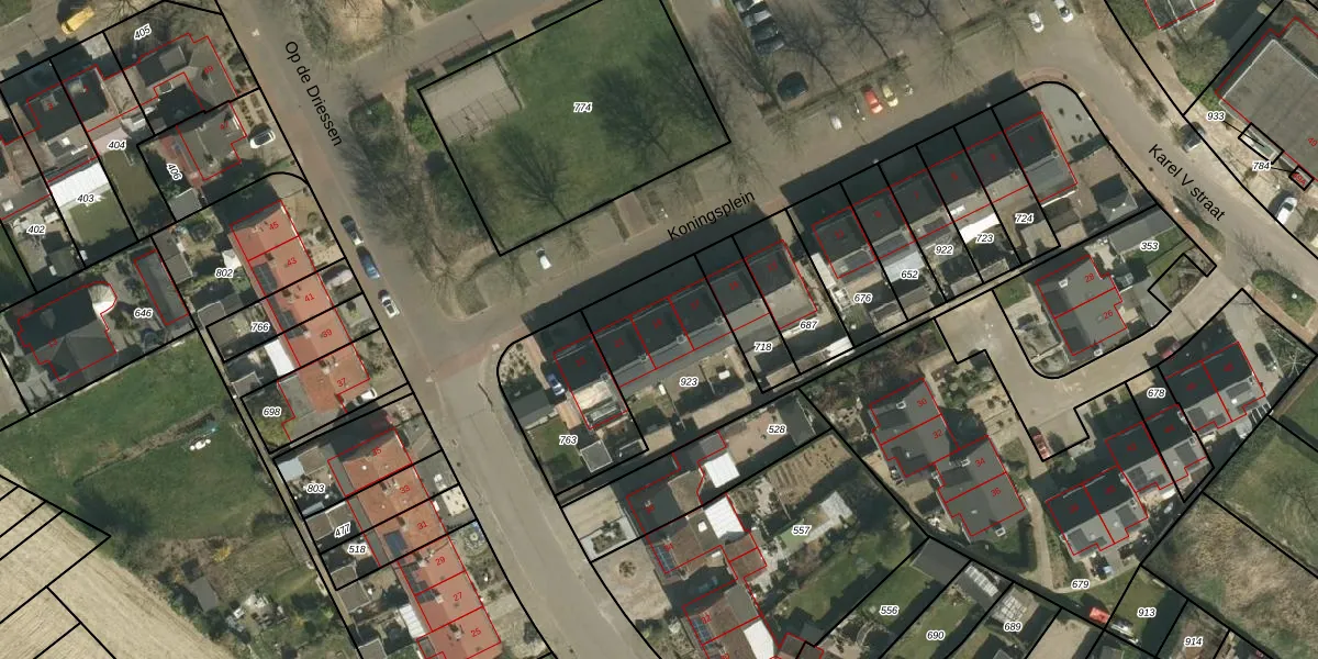 Het perceel waarop Koningsplein 19 staat heeft een oppervlakte van 916 m². Dit is een groot perceel. De perceeloppervlakte wordt geregistreerd door het Kadaster. Gedetailleerde informatie over de maten van dit perceel kunt u vinden in het rapport Kadastrale kaart met maatvoering van Koningsplein 19.
