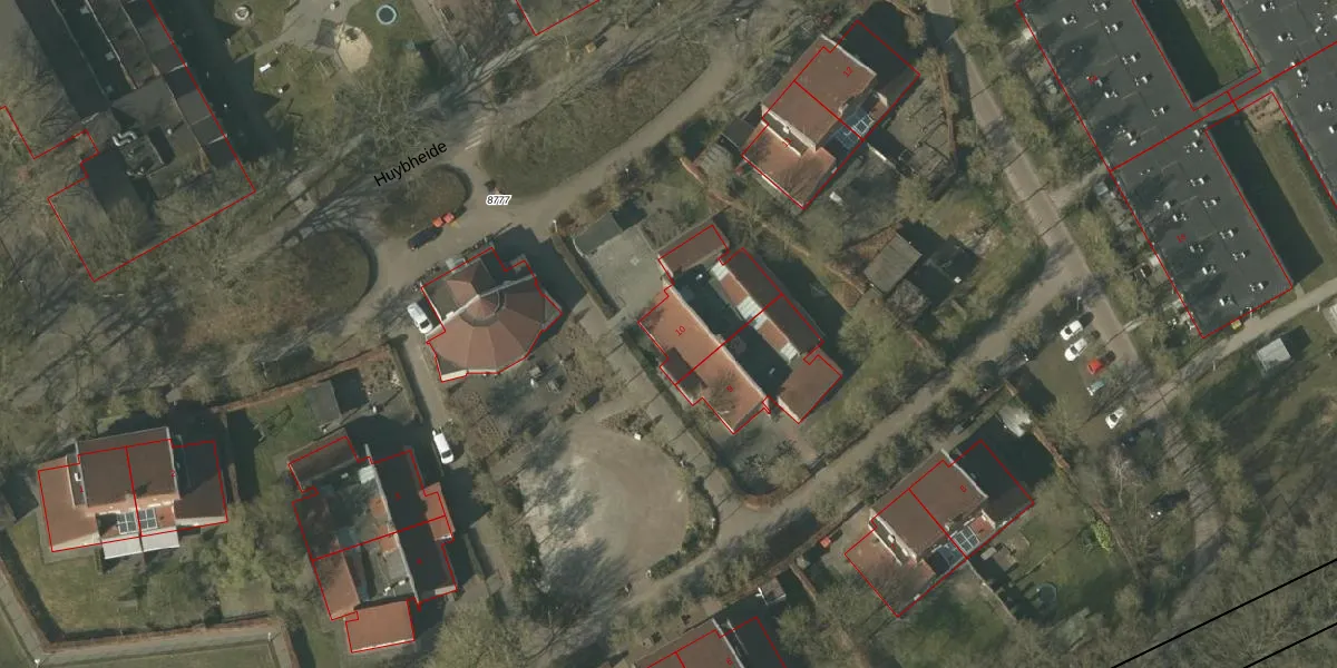 Het perceel waarop Huybheide 10 staat heeft een oppervlakte van 7,2 ha. Dit is een zeer groot perceel. De perceeloppervlakte wordt geregistreerd door het Kadaster. Gedetailleerde informatie over de maten van dit perceel kunt u vinden in het rapport Kadastrale kaart met maatvoering van Huybheide 10.